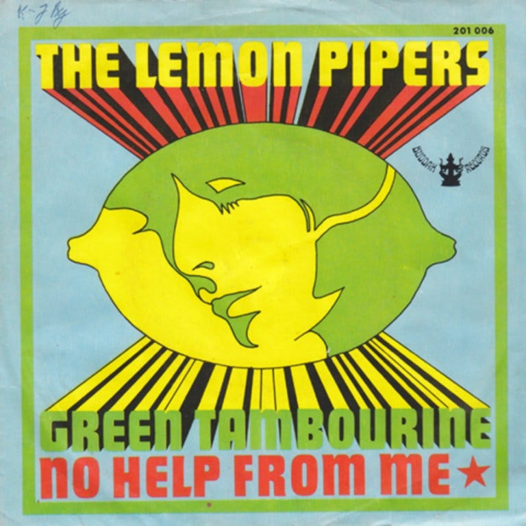 ‘Green Tambourine’ by The Lemon Pipers (from Ohio) is on their debut 1967 album of the same name on (bubblegum label) Buddha records. It was a No. 1 hit in America. This song, about a pied piper/street musician is gorgeously psychedelic with a slick production. The glorious instrumentation includes strings, finger cymbals and some wonderful tympani. It’s in the vein of Donovan’s dreamy tunes. The song was covered by Status Quo.